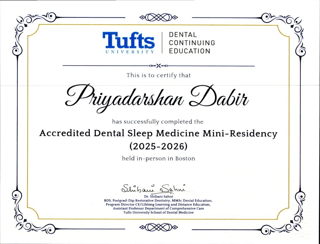 This certification affirms that Dr. Dabir has undergone specialized training in identifying and treating tongue-ties and other oral restrictions that impact growth, feeding, speech, posture, and sleep. Training includes protocols for team-based pre- and post-release care, ensuring patients receive comprehensive, functional support.